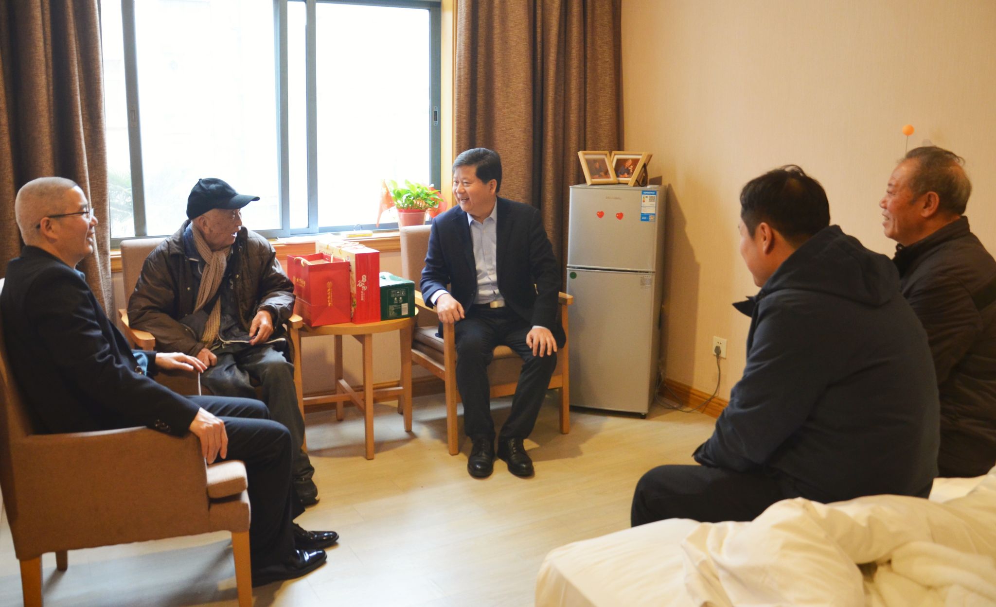 徐引正带队前往鄠邑区荣华清荷园慰问居住其中的4位老同志,黎开谊带队前往仁泰养老服务中心慰问居住其中的3位老同志,慰问组与老同志们面对面、心贴心交流,详细了解他们的身体情况,询问其在养老机构饮食、住宿、活动、服务等日常生活状况,为他们送上鲜花和慰问品,并嘱咐老同志们保持积极乐观的心态,保重身体,安享晚年生活。