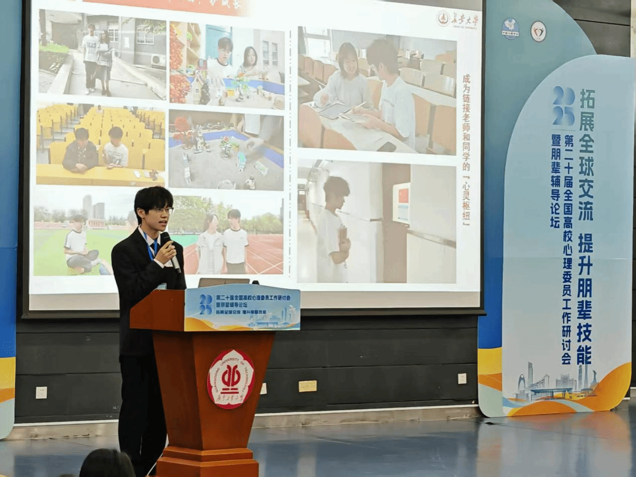 本次论坛以“拓展全球交流,提升朋辈技能”为主题,旨在加强高校心理委员队伍建设,促进心理健康教育理论与实践交流。会议期间,永利官网师生代表认真听取“朋辈心理帮扶技术”“危机干预程序”等主题报告,并与各高校代表深入交流。在分论坛环节,梁俊辉作题为《“铸魂·润心·筑桥”——思政与心理双轮驱动的育人实践探索》的主题报告。他从“价值引领筑牢思想根基、品牌活动涵育健康心态、机制建设贯通育人脉络”三个维度,系统介绍了永利官网心理委员在心理育人方面的创新实践。报告结合“情绪盲盒”“绿叶传情”“绿植领养”等品牌活动案例,生动阐释了如何通过搭建内容、机制与传播之桥,实现思政育人与心理育人的深度融合,展现了永利官网“思政与心理双轮驱动”育人模式的实效,赢得了与会代表的广泛共鸣。