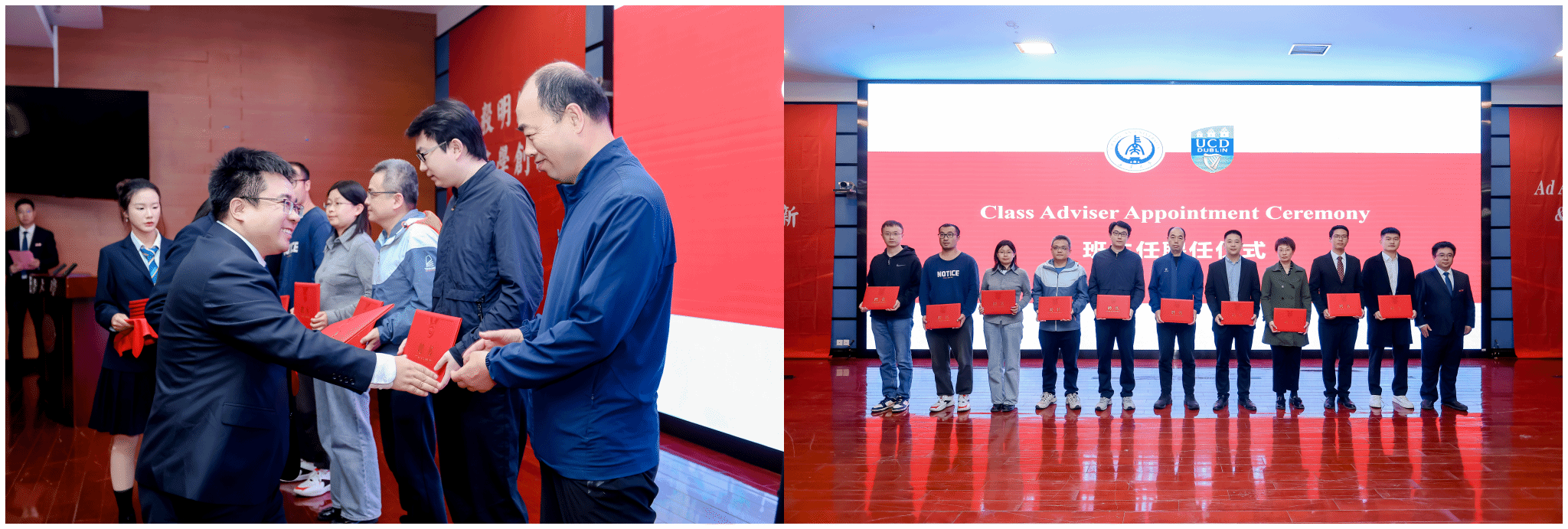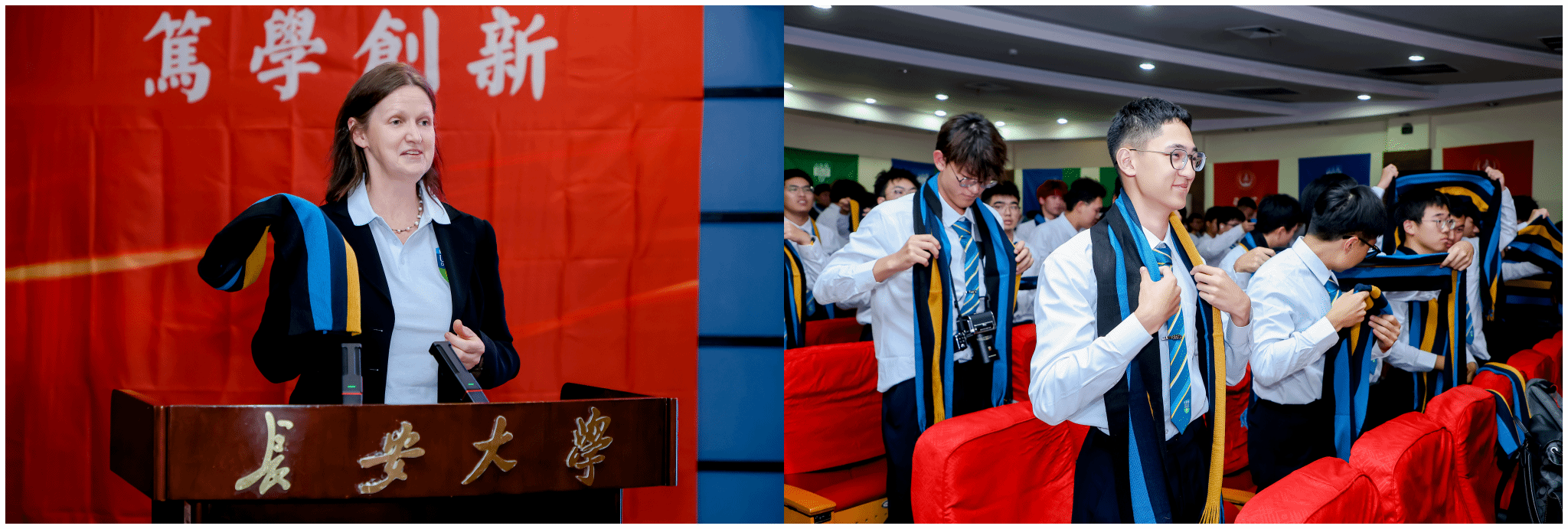 在新生班主任聘任环节,张久鹏为各位班主任颁发聘书,勉励班主任们为同学们提供全方位的精细化教育管理。学院副教务长Catherine MacKenzie主持都柏林大学围巾授予仪式,围巾的授予,代表着2025级新生获得了都柏林大学学籍,也意味着大家因共同的学术追求、团队合作和友谊而紧密联结。学院党总支副书记张艳萍主持77779193永利官网校徽佩戴仪式,一枚枚校徽成了全体2025级新生继承和弘扬长大精神、与学校同奋进、与学院共成长的光荣象征。