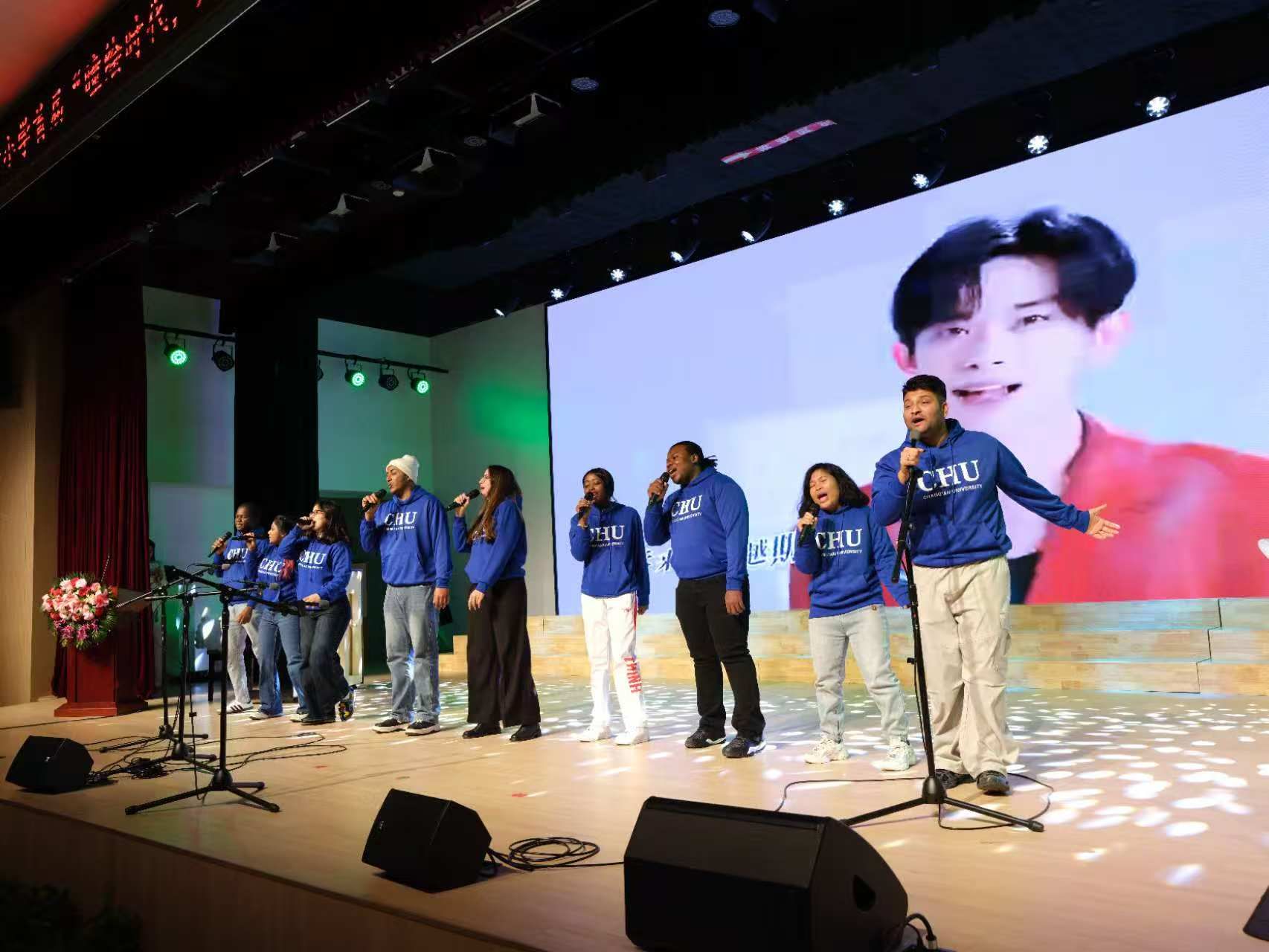艺术节当天,“中外结对·大手拉小手”合唱精彩亮相,每个班级均有一名永利官网国际学生参与演出。其中,国际学生们带来的特邀节目《一起向未来》,凭借真挚的情感和饱满的热情将现场气氛推向高潮,用青春之声生动诠释了“人类命运共同体”的美好愿景。