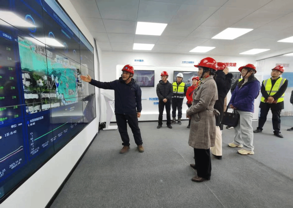 在项目管理方面,大力应用现代科技创新手段,提升工地智慧化管理水平,项目建成智慧工地管理平台,集成应用深基坑自动化监测、周边建筑物倾斜监测、水位监测及水泵自动启停系统等,实现对深基坑安全的智慧化管控,大大提升安全管理水平,同时,采用AI人脸识别管理系统及工地无死角监控管理系统,BIM项目管理技术,切实保障施工质量和施工安全。参会人员并对施工现场进行了实地检查。