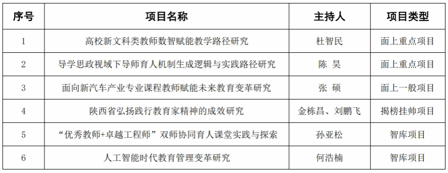 近日,陕西省教育厅正式公布了2025年度陕西省教师教育改革与教师发展研究项目立项结果,永利官网“高校新文科类教师数智赋能教学路径研究”等6个项目获批立项,涵盖面上项目、揭榜挂帅项目和智库项目等三大类别。
