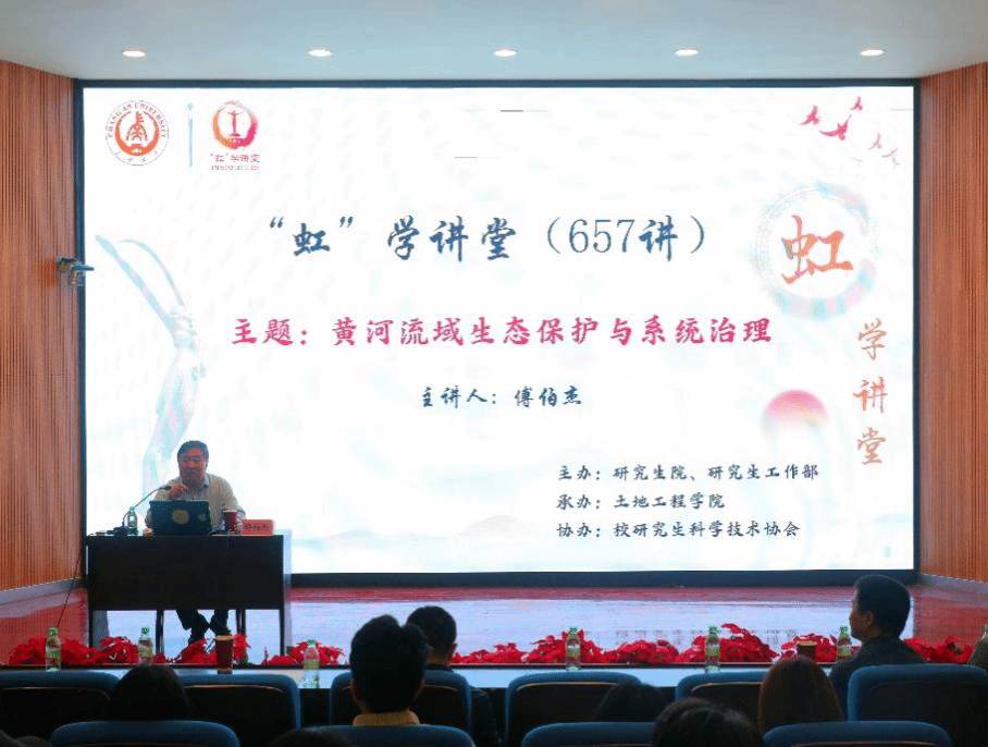 9月26日下午,由研究生院、研究生工作部主办,土地工程学院承办,校研究生科学技术协会协办的“虹”学讲堂第657讲在南校区东院伯声报告厅举办。中国科学院生态环境研究中心傅伯杰院士作题为“黄河流域生态保护与系统治理”的报告,土地工程学院执行院长王刘华主持报告会,相关学院共190余名师生参加讲座。