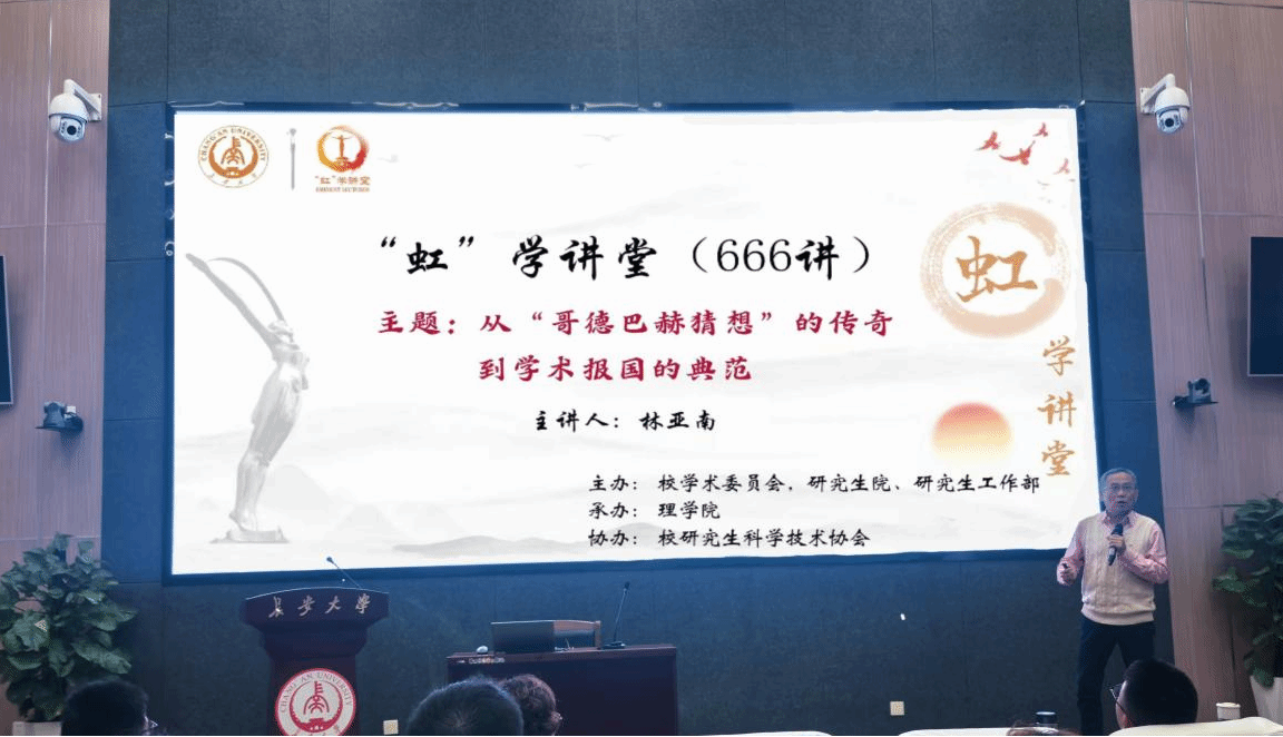 本次报告主要围绕“哥德巴赫猜想”的起源、陈景润的科研历程、陈氏定理的价值、学术报国精神四个方面展开。林亚南教授从素数概念引入,介绍了1742年哥德巴赫猜想的提出,以及希尔伯特将其纳入“23个著名问题”的背景,让听众明晰了该猜想的起源与重要性;他讲述陈景润的传奇人生,自少年求学至厦门大学刻苦钻研,再到中科院证明“1+2”(陈氏定理)的艰辛过程,既展现了陈景润对数学的痴迷,也指出该成果获得国际数学界“光辉顶点”的评价,并提及陈景润两度受邀在国际数学家大会作报告以及荣获国家自然科学一等奖等荣誉;林亚南教授聚焦学术报国精神,以陈景润在艰苦环境中坚守科研、助力国家数学事业为例,号召师生传承这份精神,以严谨的态度和不懈的追求投身学术研究。