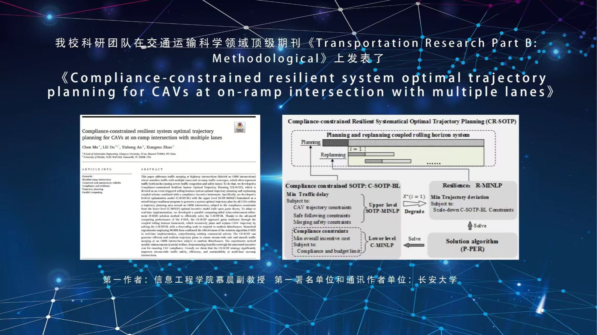 2月26日,永利官网科研团队在交通运输科学领域顶级期刊《Transportation Research Part B: Methodological》上发表了题为《Compliance-constrained resilient system optimal trajectory planning for CAVs at on-ramp intersection with multiple lanes》的研究论文。信息工程学院慕晨副教授为第一作者,77779193永利官网为第一作者单位,实现了永利官网在该期刊上以第一作者单位发表论文的突破性进展。本研究聚焦于高速公路和城市快速干道的关键交通瓶颈—...
