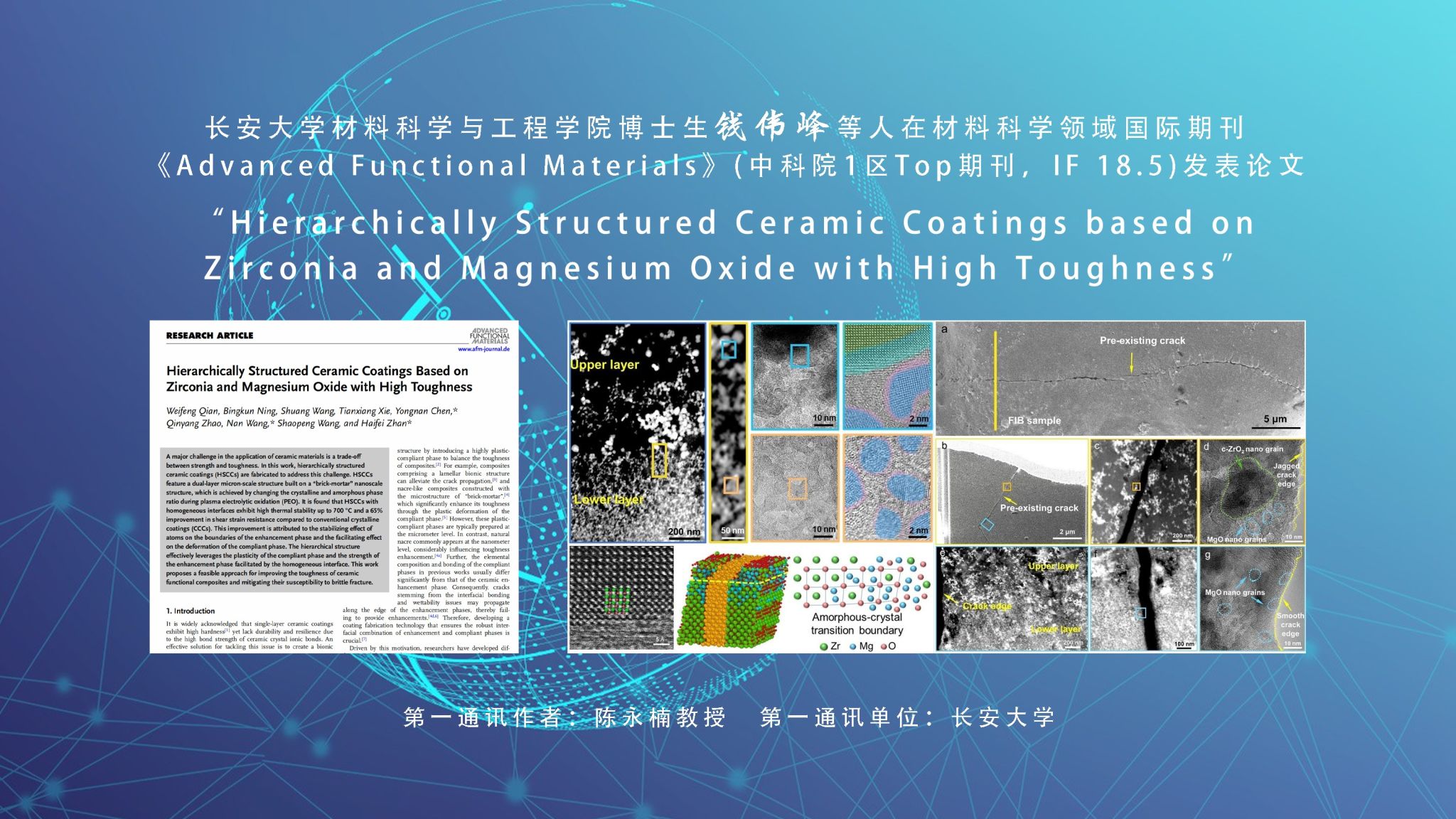 近日,永利官网材料科学与工程学院博士生钱伟峰等人在导师陈永楠教授的指导下,在材料科学领域国际期刊《Advanced Functional Materials》(中科院1区Top期刊,IF 18.5)发表论文“Hierarchically Structured Ceramic Coatings based on Zirconia and Magnesium Oxide with High Toughness”。陈永楠教授为第一通讯作者,77779193永利官网为第一通讯单位。陶瓷材料应用中的一个主要挑战是强度和韧性之间的权衡。此研究通过构建多尺度异构结构陶瓷涂层(...
