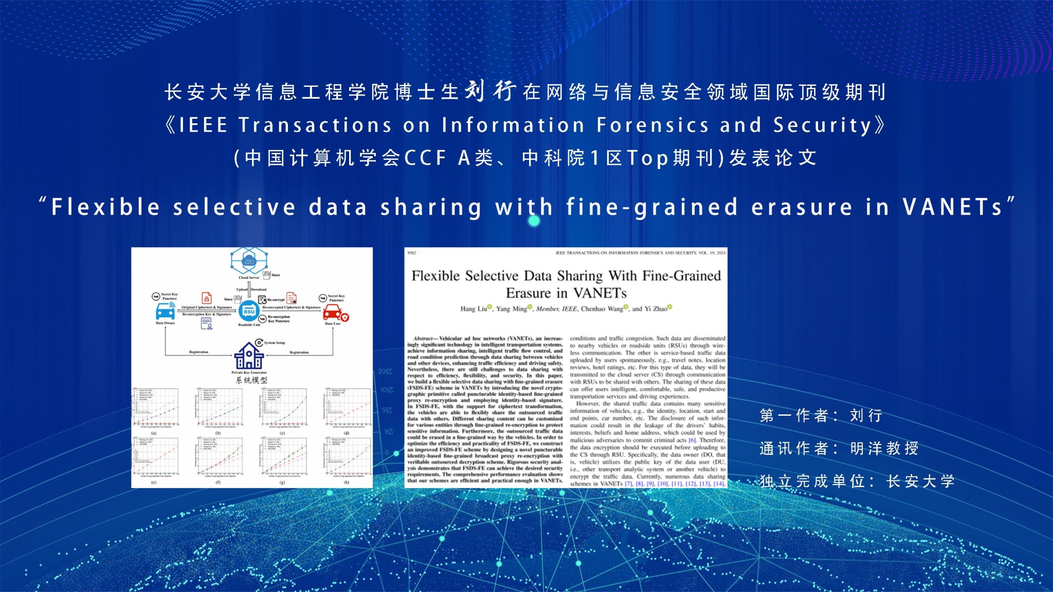近日,永利官网信息工程学院博士生刘行在导师明洋教授的指导下,在网络与信息安全领域国际顶级期刊《IEEE Transactions on Information Forensics and Security》(中国计算机学会CCF A类、中科院1区Top期刊)发表论文“Flexible selective data sharing with fine-grained erasure in VANETs”。明洋教授为通讯作者,博士生刘行为第一作者,77779193永利官网为独立完成单位。车联网能够通过车辆和其他设备的数据共享实现智能交通流控制和路况预测,...