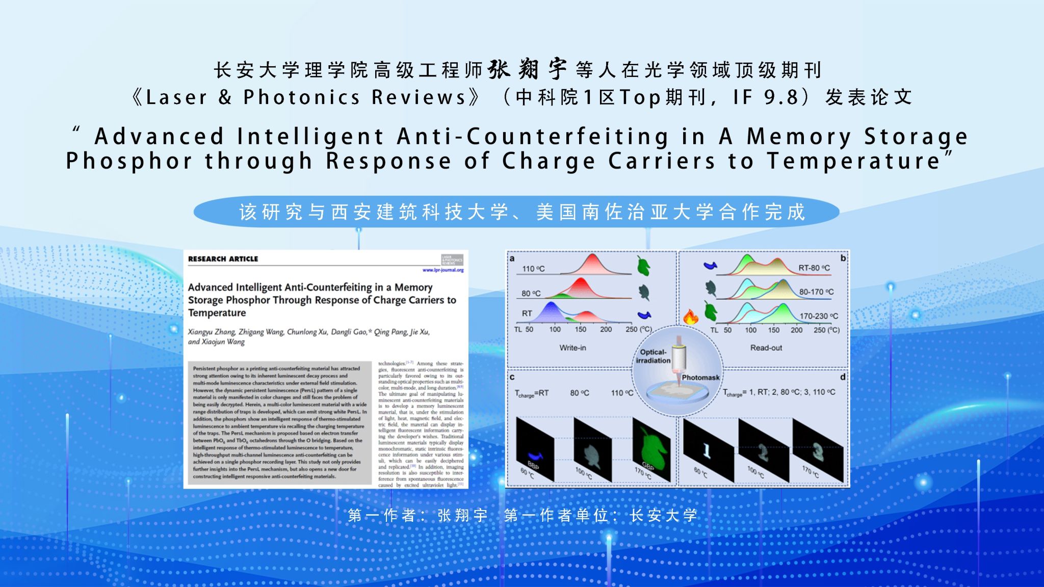 近日,永利官网理学院高级工程师张翔宇等人与西安建筑科技大学、美国南佐治亚大学合作,在光学领域顶级期刊《Laser & Photonics Reviews》(中科院1区Top期刊,IF 9.8)发表论文“ Advanced Intelligent Anti-Counterfeiting in A Memory Storage Phosphor through Response of Charge Carriers to Temperature”,报道了团队设计并开发的一种可用于高端智能防伪的对温度智能响应的新型多波段光/热激励荧光记忆存储材料NaGdGeO4:Pb,Tb荧光粉材料研究成果。...