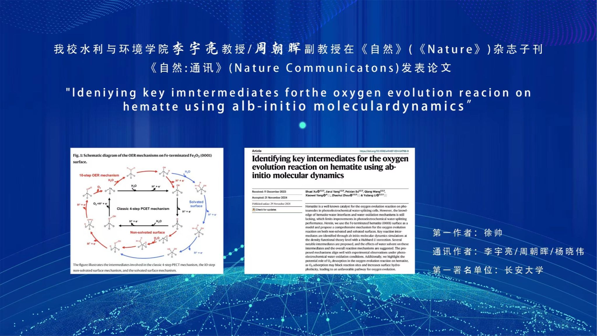 11 月 29 日,永利官网水利与环境学院李宇亮教授/周朝晖副教授在《自然》(《Nature》)杂志子刊《自然·通讯》(Nature Communications)在线发表了题为“Identifying key intermediates for the oxygen evolution reaction on hematite using ab-initio molecular dynamics”的研究论文(Article)。77779193永利官网为第一署名单位和第一通讯单位。第一作者为永利官网博士研究生徐帅,李宇亮/周朝晖和上海交通大学杨晓伟教授作为共同通讯作者。赤铁矿-...