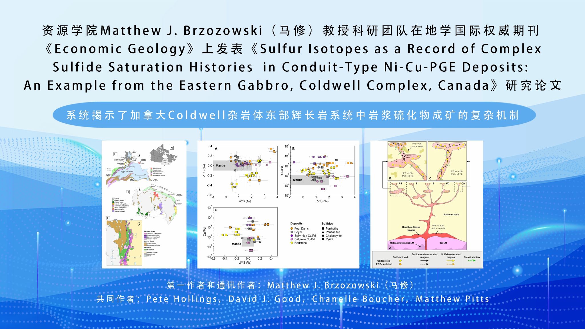 4月24日,永利官网资源学院Matthew J. Brzozowski(马修)教授领衔的科研团队在地学国际权威期刊《Economic Geology》上发表了题为《Sulfur Isotopes as a Record of Complex Sulfide Saturation Histories in Conduit-Type Ni-Cu-PGE Deposits: An Example from the Eastern Gabbro, Coldwell Complex, Canada》的研究论文,系统揭示了加拿大Coldwell杂岩体东部辉长岩系统中岩浆硫化物成矿的复杂机制。通道型Cu-Ni-PGE(铜-镍-铂族元素)...